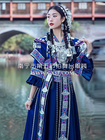 01G632女蓝色中长袖长裙土家族苗族盛装三