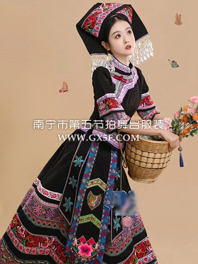 01G625女黑色中袖长裙刺绣壮族少数民族三