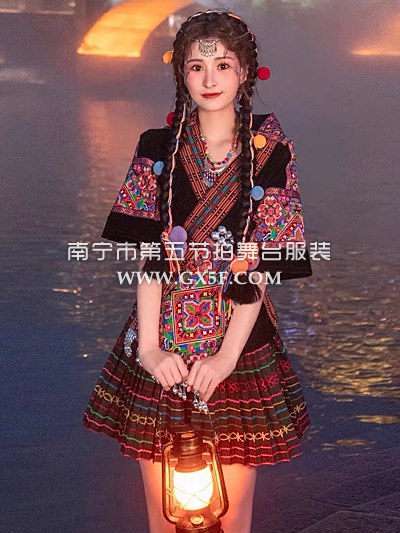 01G637女黑色短袖短裙刺绣苗族土家族三月