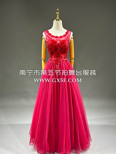 03G891红纱圆领无袖亮片贴花纱裙长礼服主