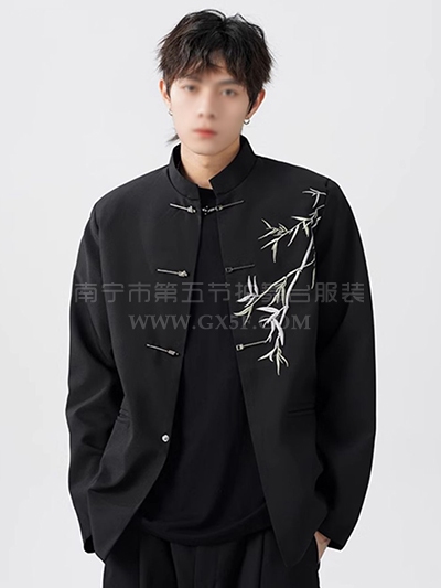 10B993黑色立领翠竹新中式唐装中山装外套