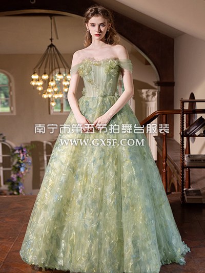 03G1345白色抹胸一字肩彩色绣花纱裙长礼服