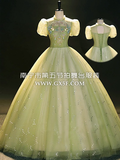 03G1352青色短袖钉珠纱裙长礼服