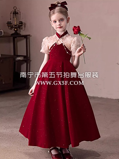 12G1722儿童女红色中式领短袖长礼服公主裙
