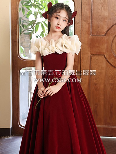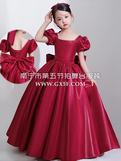 12G1729儿童女酒红色短袖珍珠领公主裙长礼