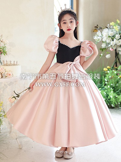 12G1725儿童女粉黑圆领短袖长礼服公主裙