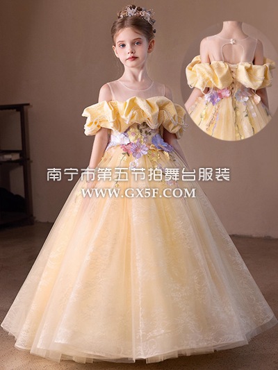 12G1728儿童女黄色圆领一字肩纱裙长礼服公