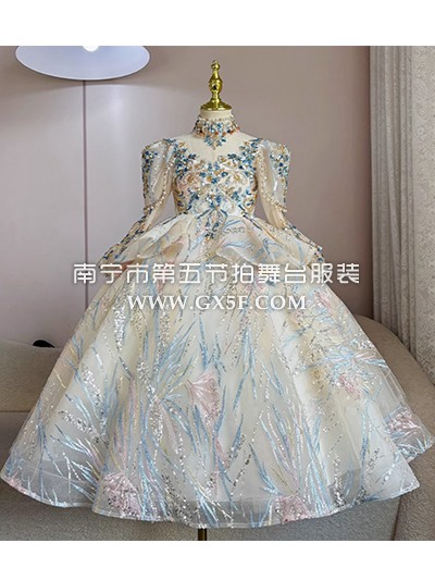 12G1731儿童女米黄长袖蓝银钉珠亮片纱裙长