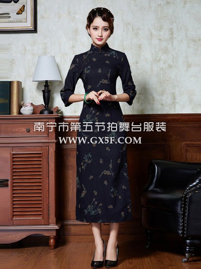 07G355蓝黑底梅花图七分袖中长款纯色复古
