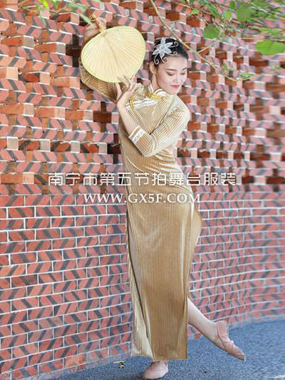 07G346米黄色长袖长旗袍永不消逝的电波渔