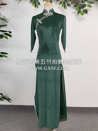07G154A女绿色包肩白条纹复古五四短旗袍修