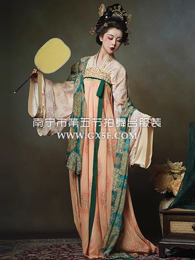 08B1603浅杏外披斑驳绿袍橘色裙宋制阔袖对