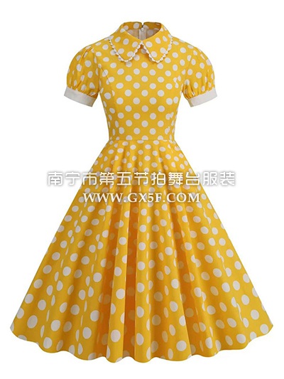 08G1561黄底白波点翻领赫本港风复古连衣裙