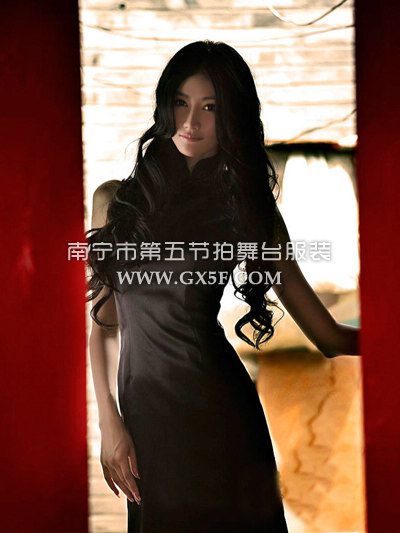 07G098A女黑色无袖素色复古上海滩丝绸长旗