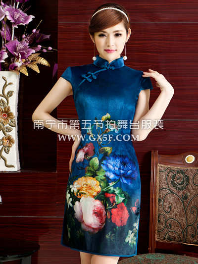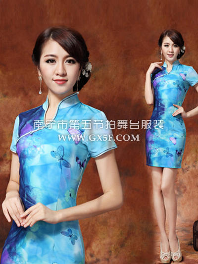 07G100A女蓝色短袖梦幻图复古短旗袍礼仪服