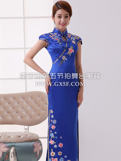 07G106A女蓝色包肩绣花开叉礼仪服长旗袍教