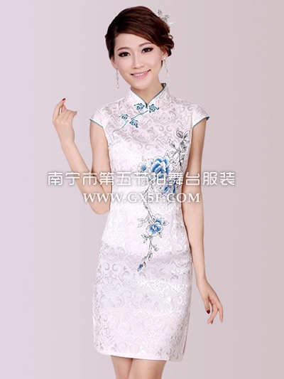 07G156A女白色包肩青花瓷刺绣花复古短旗袍