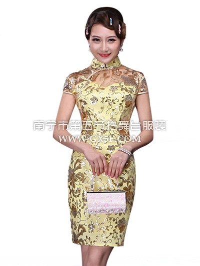 07G127A女金色包肩亮片水溶蕾丝短旗袍夜店