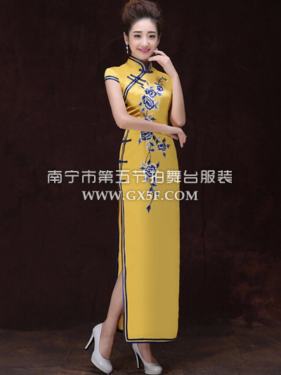 07G137女黄色包肩双线包边绣花长旗袍修身