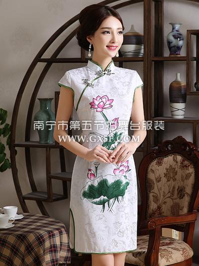 07G161A女白色包肩提花棉荷花图短旗袍修身