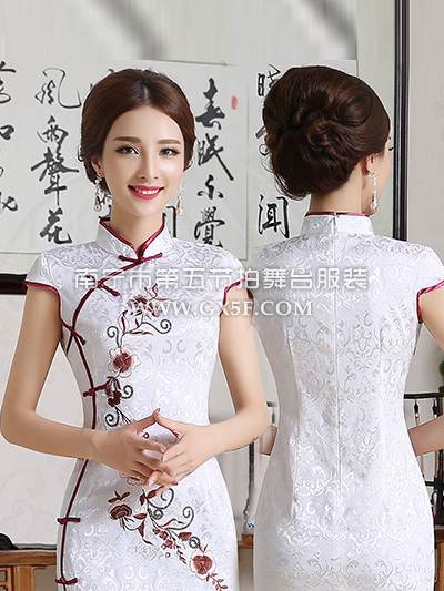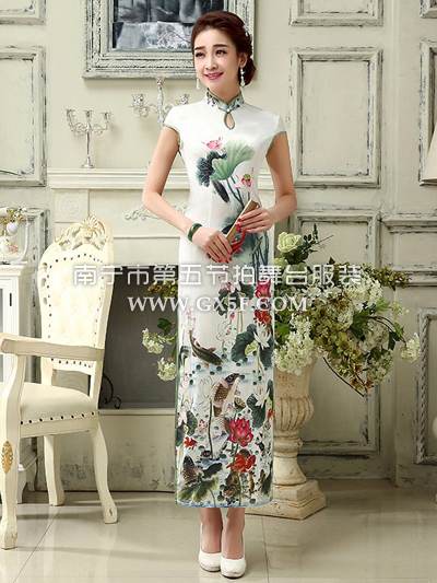 07G181A女乳白色包肩木兰花图长旗袍修身礼
