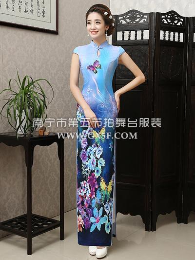 07G176A女蓝色包肩孔雀蓝蝴蝶花朵图长旗袍