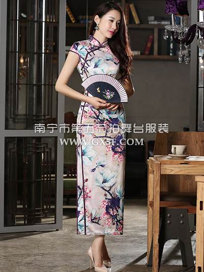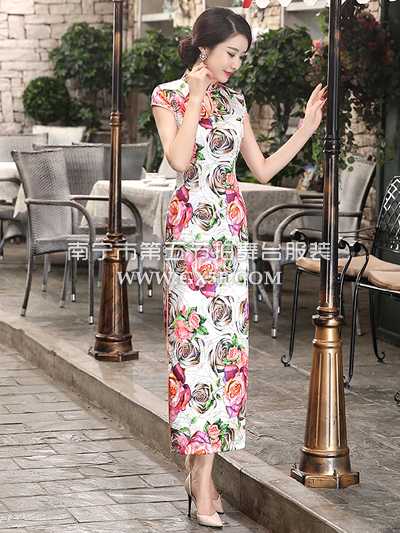 07G178A女藕色包肩玫瑰盛开图长旗袍修身礼