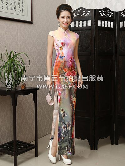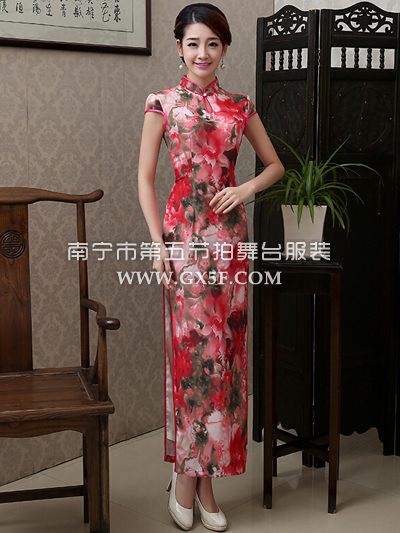 07G180A女红色包肩印花长旗袍修身礼仪服教