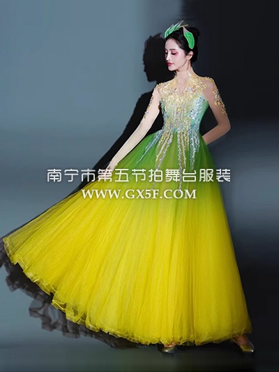 02G1593黄绿长袖连衣裙开场舞歌伴舞大摆裙