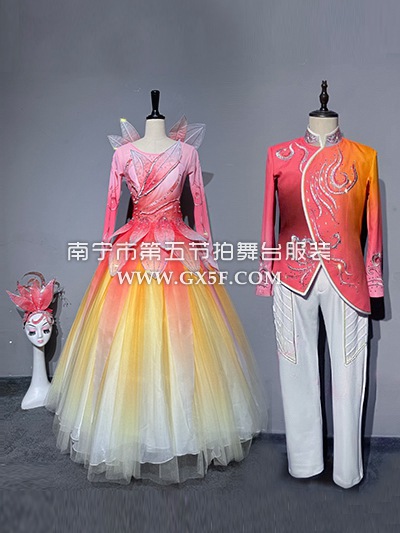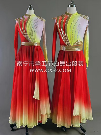 02G1504红黄渐变长袖印花大摆裙伴舞开场舞