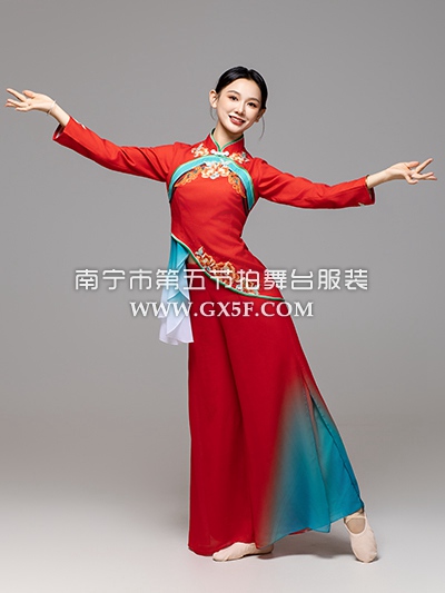 02G1296青绿色渐变长袖长裤秧歌扇子舞古典