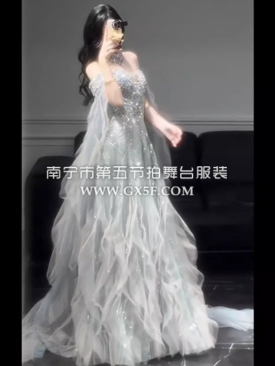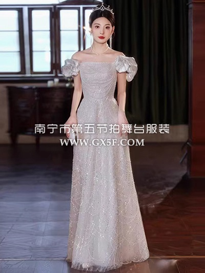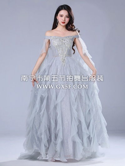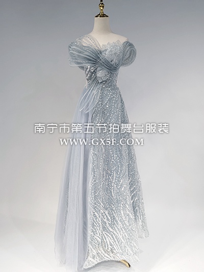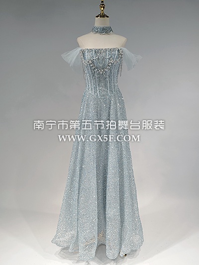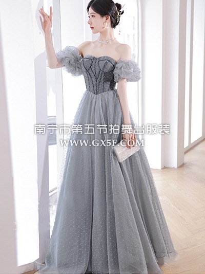 03G1264灰蓝色星星一字肩钉珠纱裙长礼服