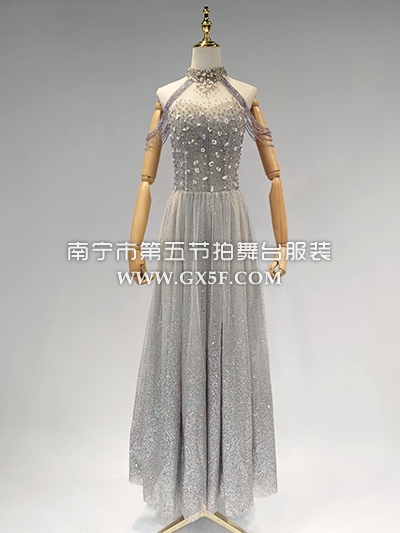 03G1314银色挂脖吊珠流苏亮片长礼服