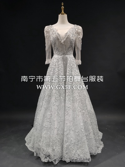 03G1123灰蓝v领泡泡袖亮片钉珠纱裙长礼服