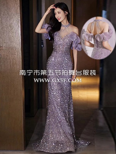 03G1301紫色亮片挂脖一字肩鱼尾长礼服