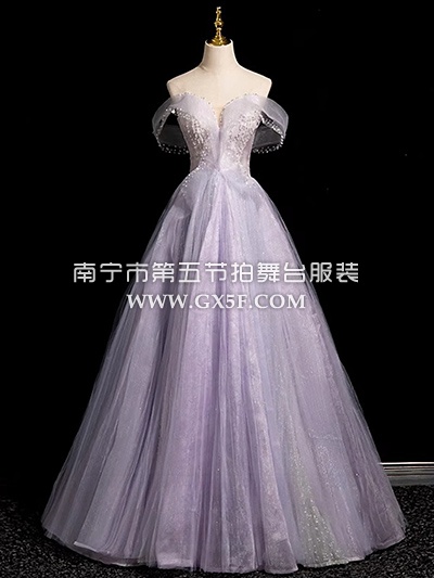 03G1204紫色一字肩亮片钉珠纱裙长礼服