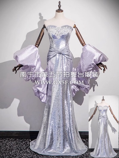 03G1364银色亮片抹胸修身鱼尾长礼服含紫色