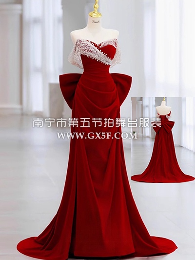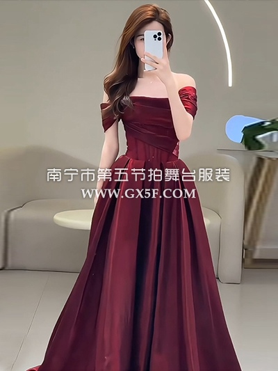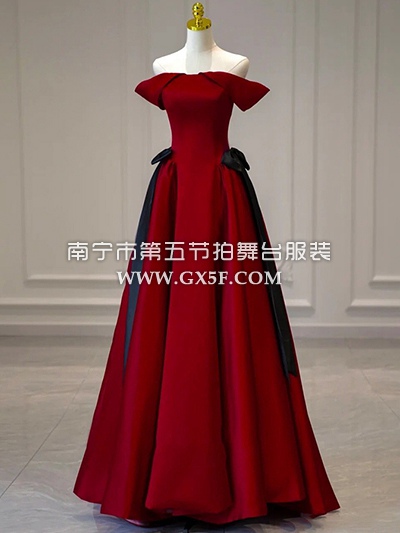 03G1289酒红色抹胸一字肩黑色蝴蝶结长礼服