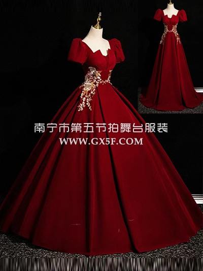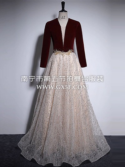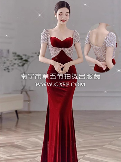 03G1326酒红丝绒中袖闪亮长裙长礼服