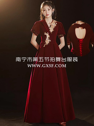 03G1294酒红色丝绒短袖绣花长礼服敬酒服