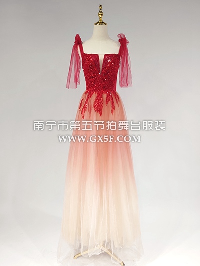 03G1274酒红粉纱裙吊带一字肩长礼服