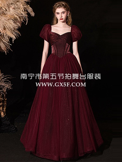03G1324酒红车厘子色泡泡袖钉珠网纱长礼服