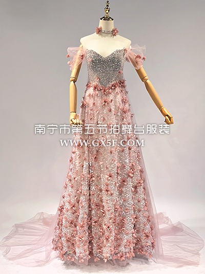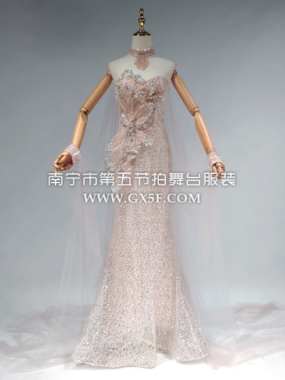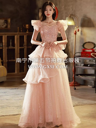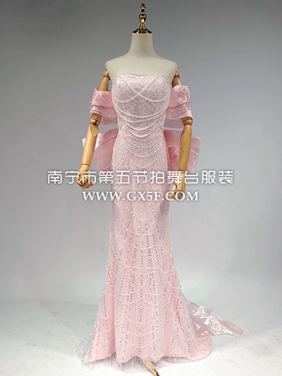 03G1277粉色圆领一字肩钉珠拖尾主持长礼服