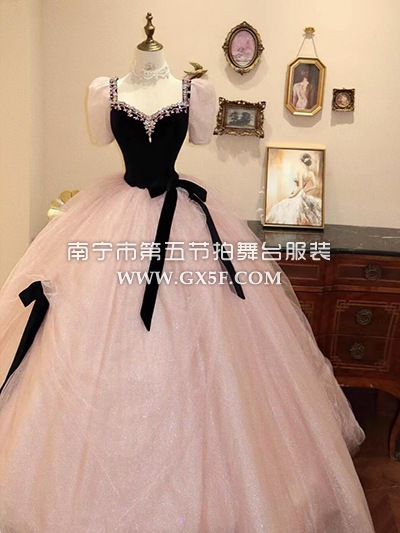 03G1372粉黑圆领短袖蝴蝶结纱裙长礼服朗诵