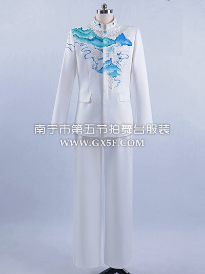 10B1019蓝绿山水云岫白色钉珠亮片中山装合