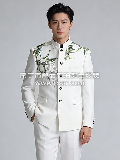 10B1038白色绿竹钉珠中山装新中式国风西装