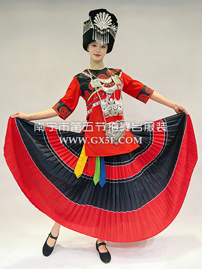 01G976女红黑中袖彝族大摆裙盛装礼赞舞蹈