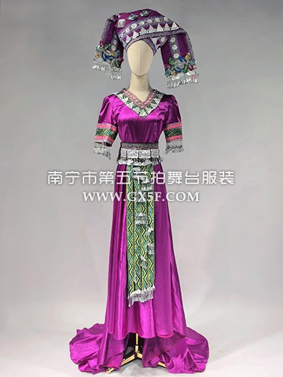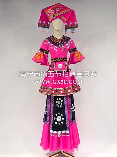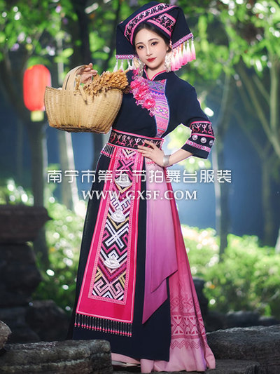 01G992女藏蓝粉中长袖长裙壮族花山壁画天