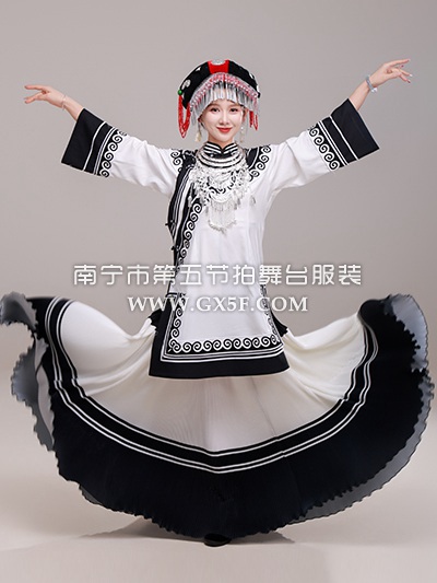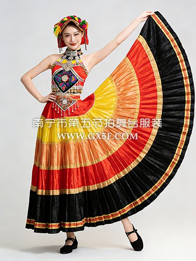 01G976女红黑中袖彝族大摆裙盛装礼赞舞蹈