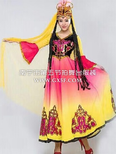 01G856女玫红黄长袖连衣裙新疆维吾尔族